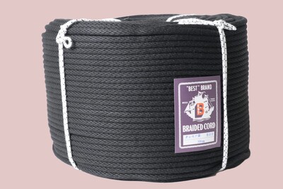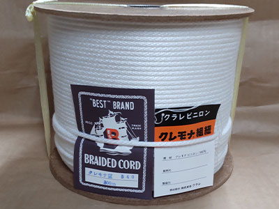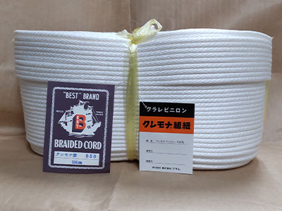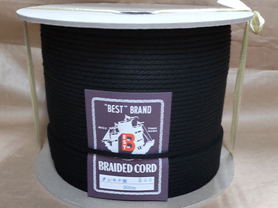 12本のストランドで構成されたロープです。糸の束は12本で組み合っているため、よじれが発生しにくいのが特徴です。強度は3打ちロープに比べると低下しますが、しなやかで、柔らかく扱い易くなっています。湿気を含むと縮み硬化する性質があります。株式会社クラレ製のビニロン100%原着糸を使用。黒色のため、舞台関係にも使用されております。
